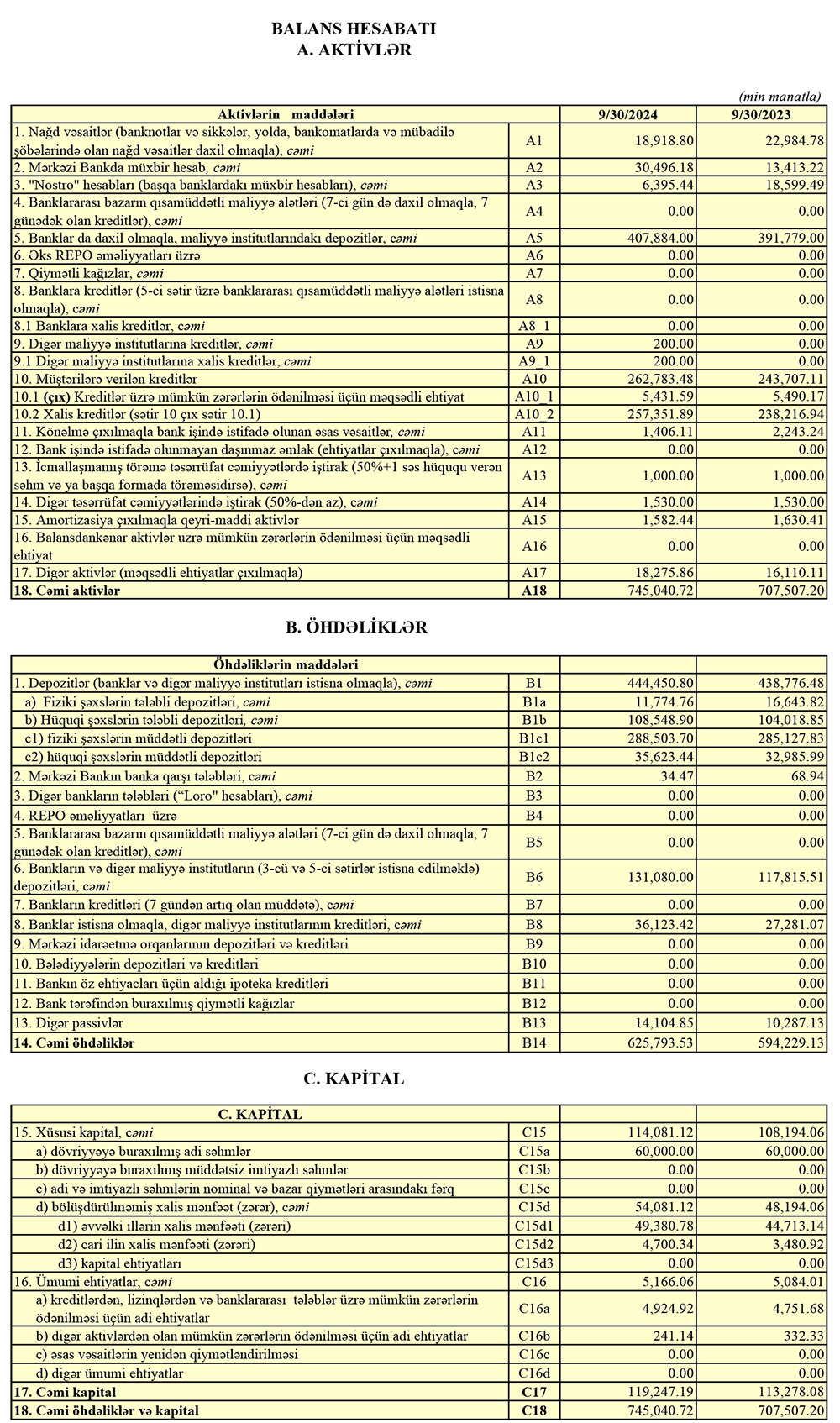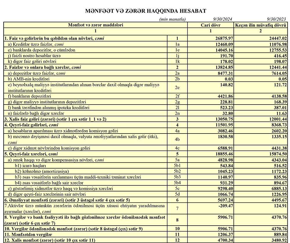 ASB-nin əməliyyat mənfəəti 2024-cü ilin 9 ayında 2023-cü ilin 9 ayı ilə müqayisədə 1 milyon 202 min manat və ya 26,7% artaraq 5 milyon 697 min manat təşkil edib.