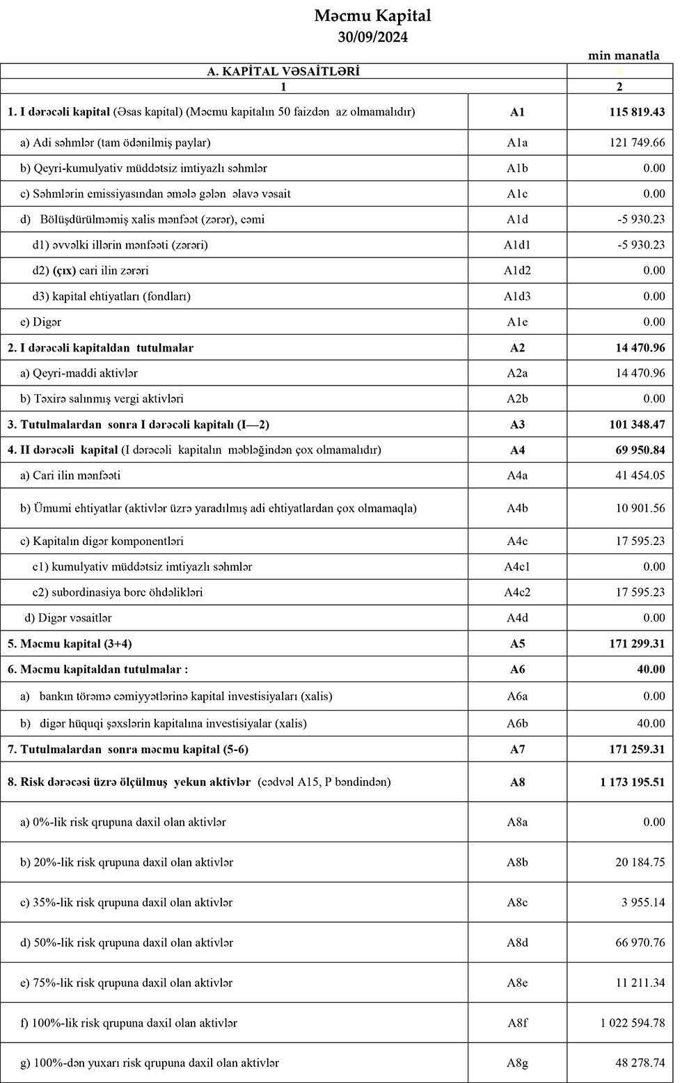 30 sentyabr 2024-cü il tarixində "AccessBank" 171 milyon 259 min manat məcmu kapitala malik olub.