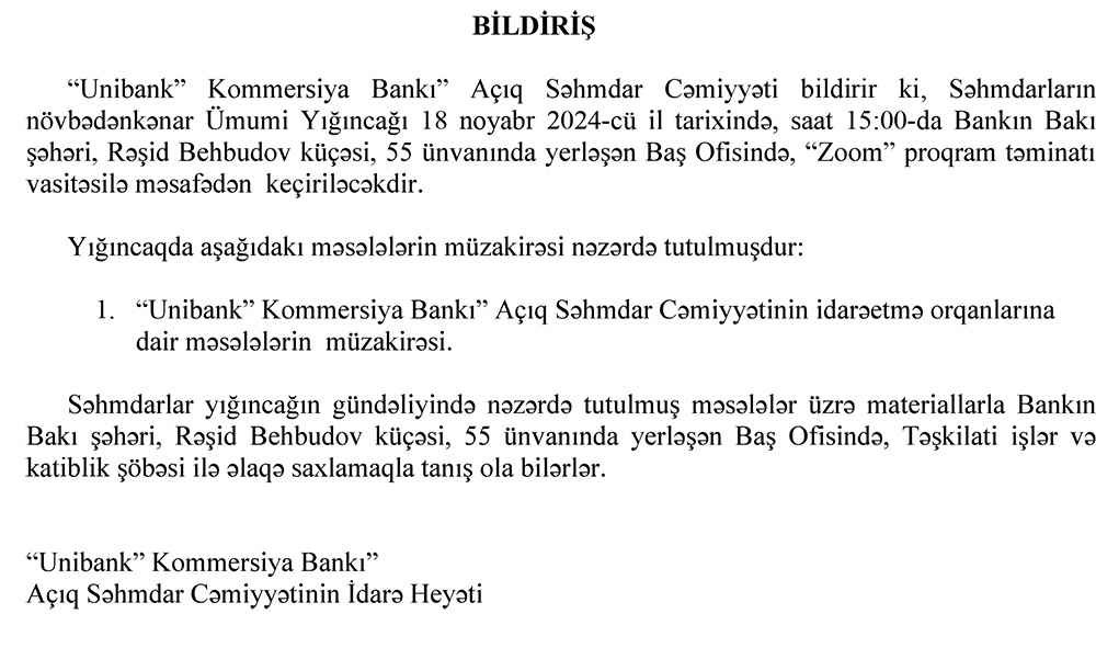 18 noyabr 2024-cü il tarixində "Unibank Kommersiya Bankı" ASC səhmdarlarının növbədənkənar Üumi Yığıncağı keçiriləcək.