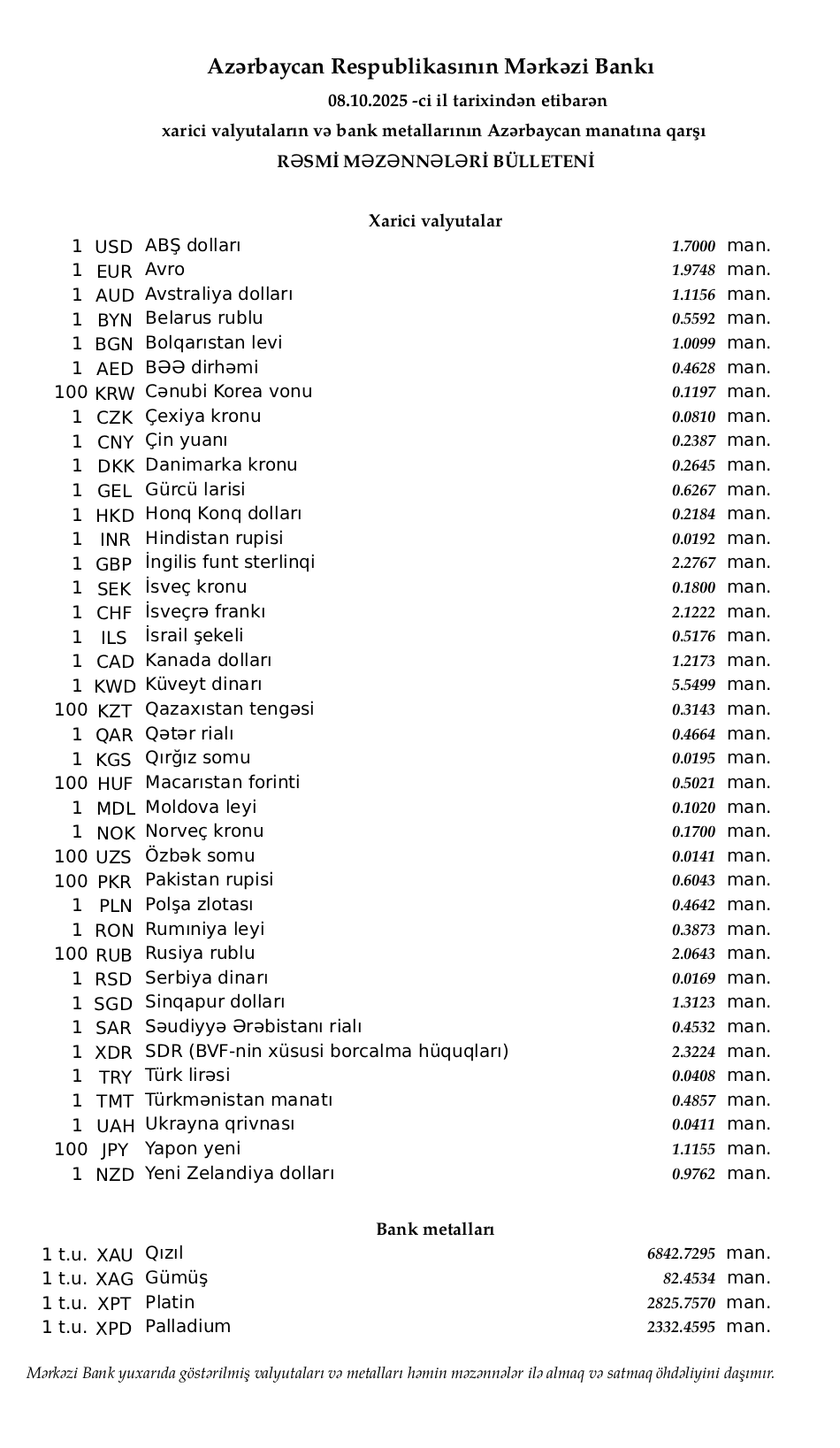 Rəsmi məzənnələr açıqlandı