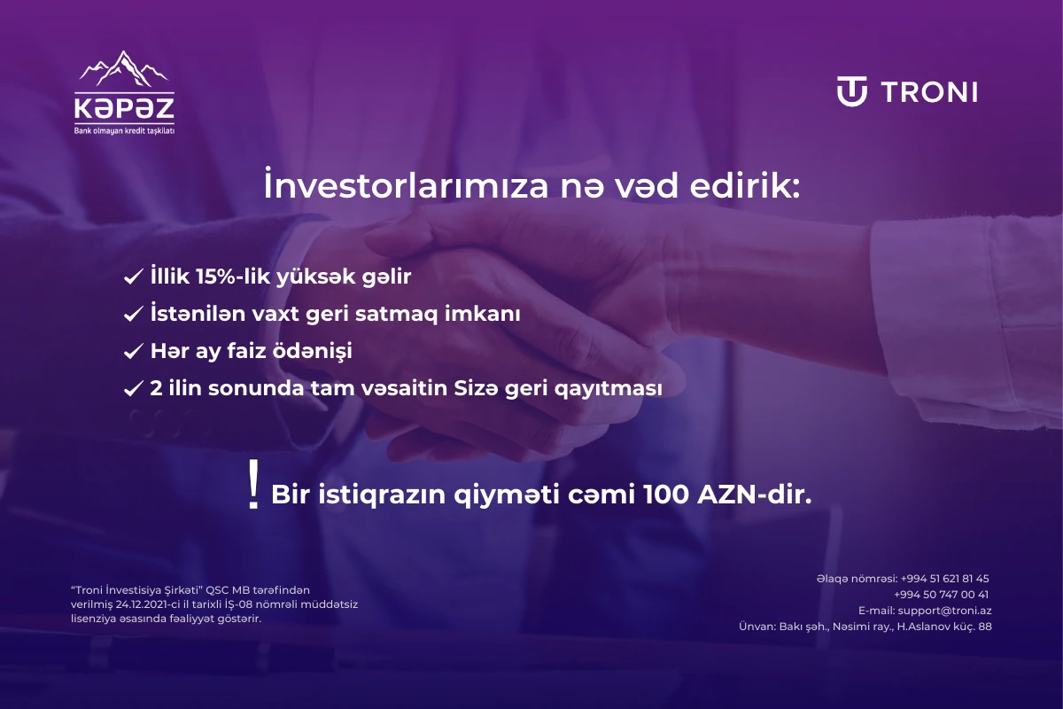 Qeyd edək ki, sözügedən istiqrazlar abunə yazılışı ilə yerləşdiriləcək və proses 10 gün davam edəcək. Siz də bu ideal şansı qaçırmaq istəmirsinizsə və daha ətraflı məlumat üçün emissiyanın anderrayteri olan Troni İ.Ş.-nə aşağıdakı əlaqə vasitələri ilə müraciət edə bilərsiniz.