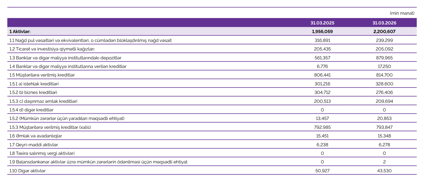 Bankın yaydığı press-relizdə bildirilir ki, 01 aprel 2026-cı il tarixinə Bankın aktivləri 2,2 milyard manata çatıb. Müqayisə üçün, ötən ilin eyni dövründə bu göstərici 1,9 milyard manat təşkil edirdi. Kredit portfeli 814,7 milyon manata yüksələrək illik müqayisədə 8 milyon manat artıb.