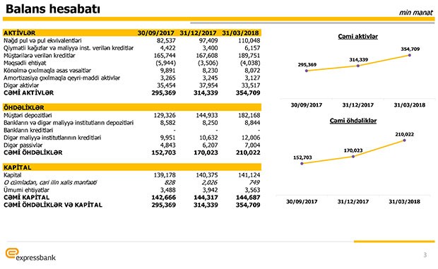 "ExpressBank"ın müştərilərə verdiyi cəmi kreditlər ötən ilin sonundakı 167 milyon 608 min manatdan 189 milyon 751 min manata qalxıb. İlk 3 ayda Bankın cəmi aktivəri isə 314, milyon 339 min manatdan 354 milyon 709 min manata yüksəlib.