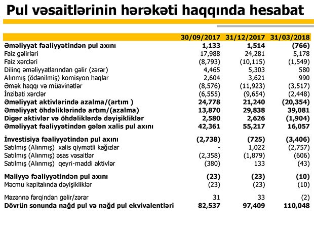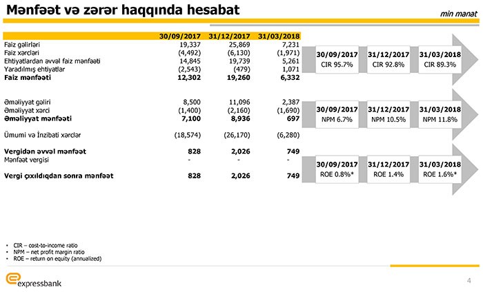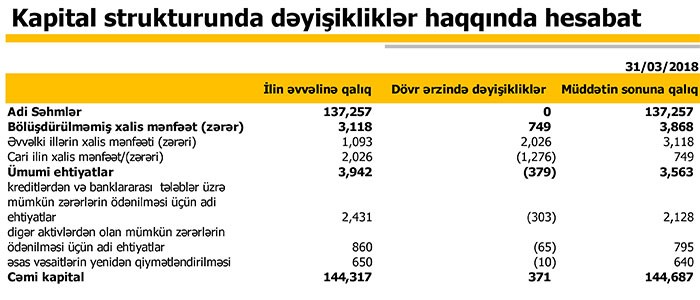 2018-ci ilin ilk rübündə Bankın əməliyyat mənfəəti 7 milyon 29 min manat, ümumi inzibati xərclər isə 6 milyon 280 min manat təşkil edib. Nəticədə Bank ilk rübü 749 min manat xalis mənfəətlə bağlayıb.