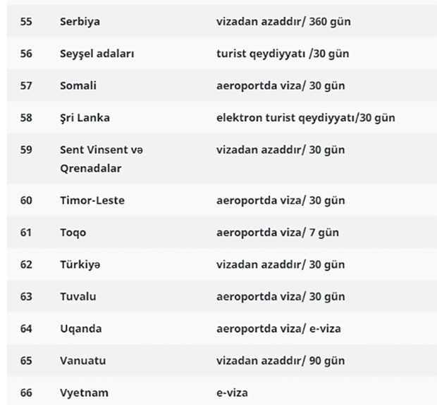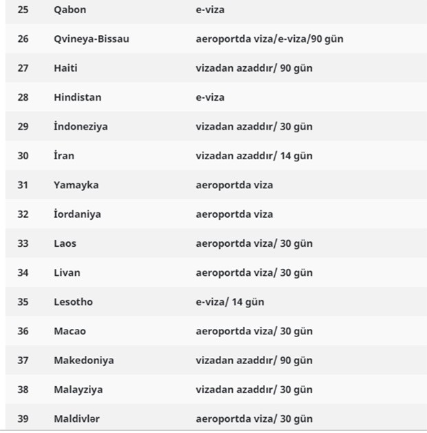 Bəzi ölkələr üzrə vizanı elektron qaydada, bəzilərində hava limanında almaq olar, bəzilərində isə vizaya ehtiyac yoxdur.