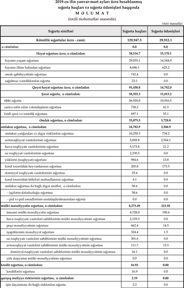 2019-cu ilin yanvar-mart aylarında ölkədə fəaliyyət göstərən sığorta şirkətləri tərəfindən 201.2 milyon manat məbləğində sığorta haqları toplanıb, 46.2 milyon manat məbləğində sığorta ödənişləri həyata keçirilib.