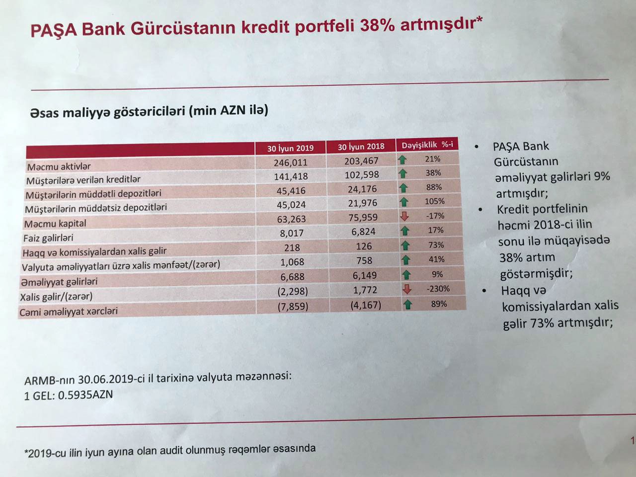 Qeyd edək ki, 2018-ci ilin 1-ci yarısı ilə müqayisədə 2019-cu ilin 1-ci yarısında “PAŞA Bank Gürcüstan” böyüməsinə və gəlirlərinin artmasına baxmayaraq həmin dövrü 2 milyon 298 min manat xalis zərər ilə başa vurub. 30 İyun 2018-ci il tarixi ilə müqayisədə “PAŞA Bank Gürcüstan”ın cəmi aktivləri 21% artaraq 30 İyun 2019-cu il tarixində 246 milyon 11 min manata çatıb. Bankın kredit portfeli isə 38% artaraq 141 milyon 418 min manata yüksəlib.