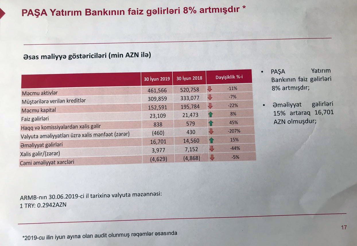 "PAŞA Bank"ın Türkiyədə törəmə bankı olan "PAŞA Yatrım Bankası" isə 2019-cu ilin 1-ci yarısını 3 milyon 977 min manat xalis mənfəət ilə bağlayıb. Ötən ilin eyni dövrü ilə müqayisədə "PAŞA Yatrım Bankası"nın xalis mənfəəti 44% azalıb.
