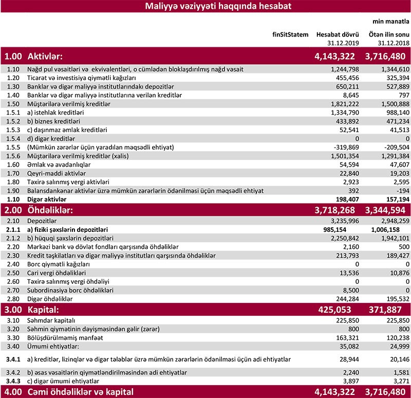Ötən il ərzində müştərilərə verilmiş xalis kreditlər (mümkün zərərlər üçün yaradılan məqsədli ehtiyat xaric kredit portfeli) 209 milyon 970 min manat artaraq 2019-cu ilin sonunda 1 milyard 501 milyon 354 min manat təşkil edib.