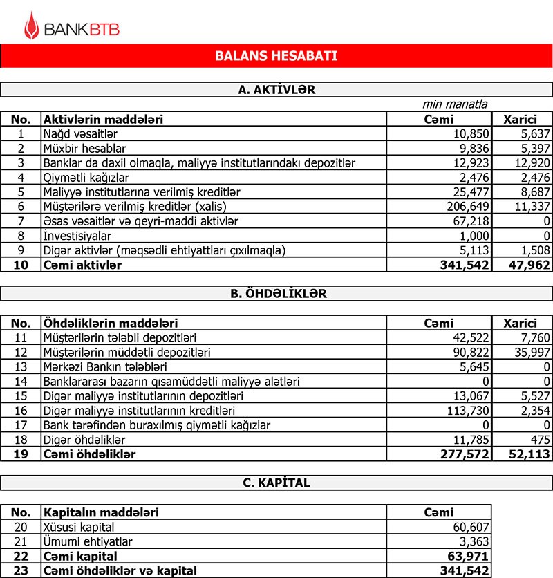 2019-cu ilin göstəricilərinə əsasən Bank BTB-nin cəmi aktivləri 341 milyon 542 min manat təşkil edib ki, bu da ötən ilin müvafiq dövrü ilə müqayisədə 9% artım deməkdir.