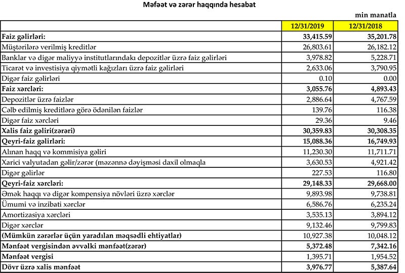 Müqayisə üçün qeyd edək ki, 2018-ci ildə “Yapı Kredi Bank Azərbaycan”ın cəmi faiz və qeyri-faiz gəlirlləri 51 milyon 950 min manat, faiz və qeyri-faiz xərcləri 34 milyon 561 min manat, əməliyyat mənfəəti 17 milyon 389 min manat, mümkün zərərlər üçün yaradılan məqsədli ehtiyatlara ayırma 10 milyon 48 min manat, ödənilmiş mənfəət vergisi 1 milyon 954 min manat təşkil etmişdi.