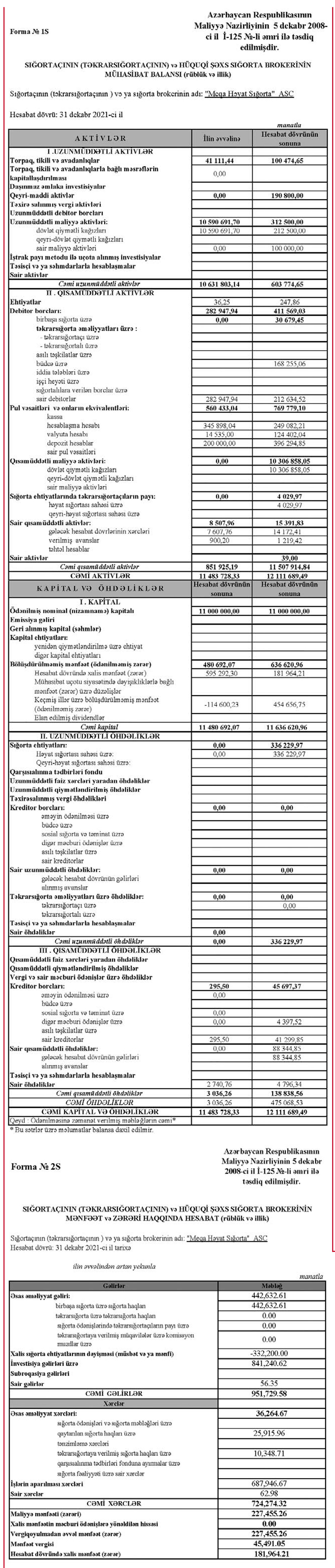 Xatırladaq ki, "Meqa Sığorta" ASC-nin 2021-ci ildə xalis mənfəəti 2020-ci illə müqayisədə 1 milyon 807 min manat və ya 31,5% azalaraq 3 milyon 920 min manat təşkil edib. "Meqa Sığorta" 2020-ci ili 5 milyon 727 min manat xalis mənfəət ilə bağlamışdı.