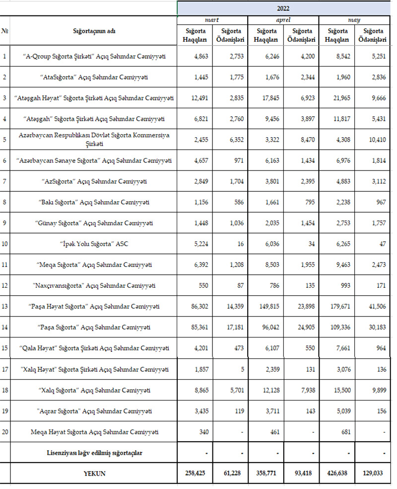 Bu ilin yanvar-may aylarında Azərbaycandakı 20 sığorta şirkətinin xətti ilə 426 milyon 638 min manat məbləğində sığorta haqqı toplanılıb.