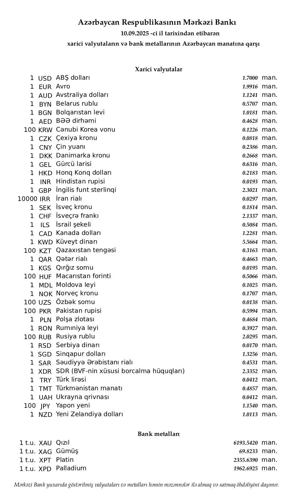 Rəsmi məzənnələr açıqlandı