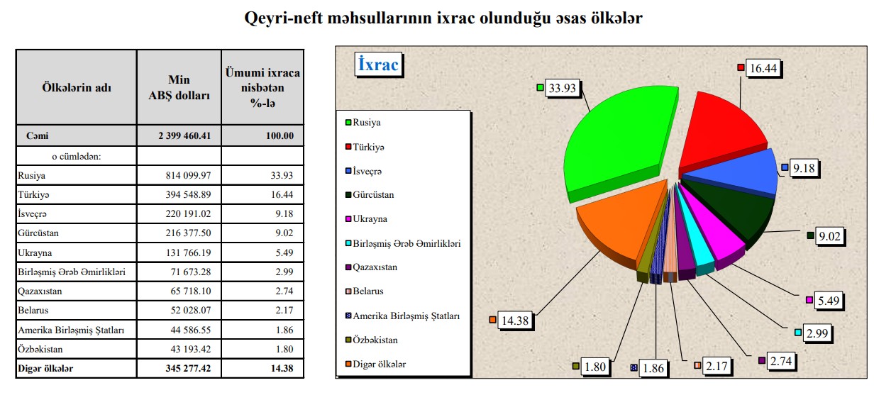 Marja.az xəbər verir ki, 2025-ci ilin 8 ayı (yanvar-avqust) ərzində Azərbaycanın qeyri-neft məhsullarının ixracının dəyəri 2 milyard 399 milyon 460 min dollar olub. İxracın 814 milyon 100 min dolları va ya 34%-i Rusiyaya, 394 milyon 548 min dolları və ya 16,44 %-i Türkiyəyə, 220 milyon 191 min dolları və ya 9,18 %-i İsveçrəyə, 216 milyon 377 min dolları və ya 8,79%-i Gürcüstana, 131 milyon 766 min dolları və ya 5,49%-i Ukraynaya həyata keçirilib.