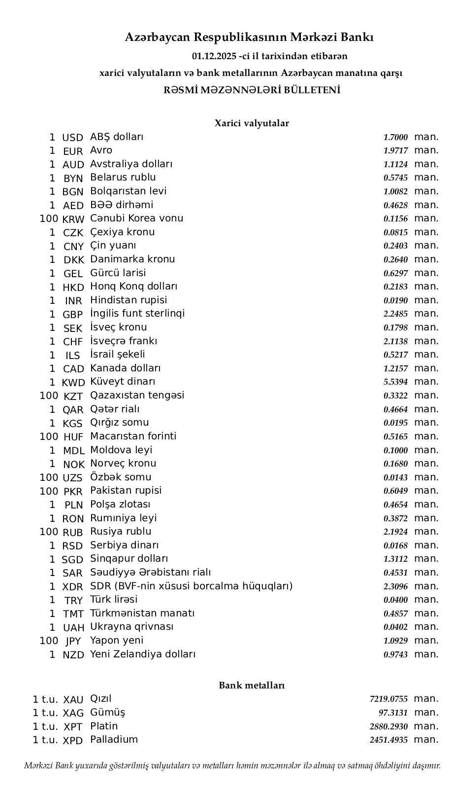 Dolların bazar ertəsi üçün rəsmi məzənnəsi müəyyən olunub