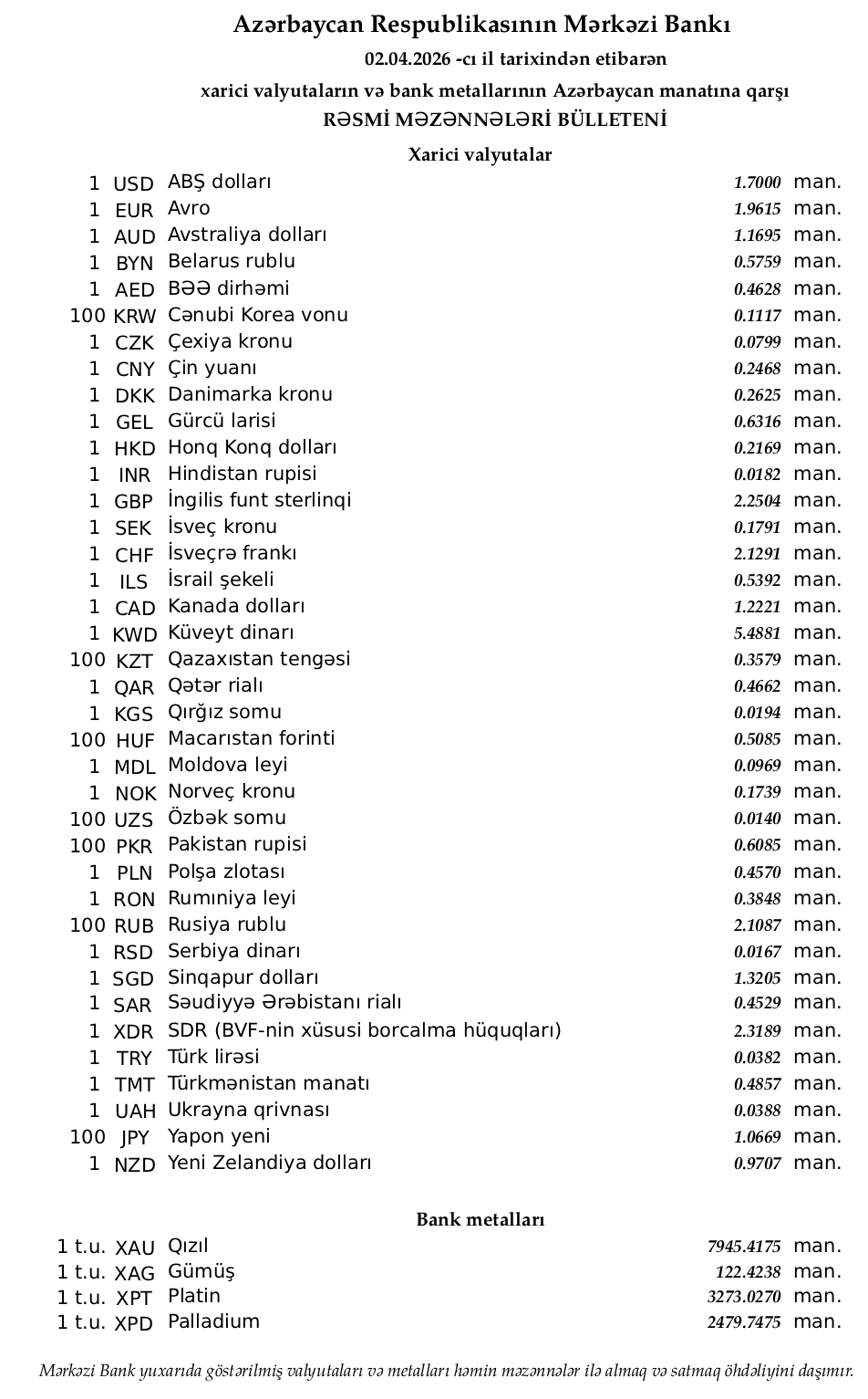 Rəsmi məzənnələr açıqlandı 02.04.2026 tarixindən etibarən