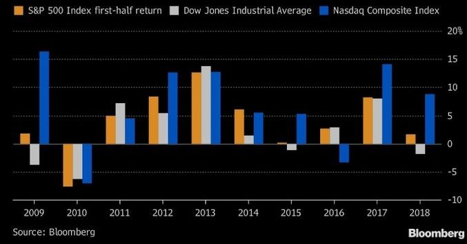 İlin ilk yarısında S&P 500 və Nasdaq İndeksləri yüksəliş qeyd edib, (Dow Jones) Dou Cons Sənaye İndeksi isə ticarət müharibəsi narahatlıqları ilə düşüb.