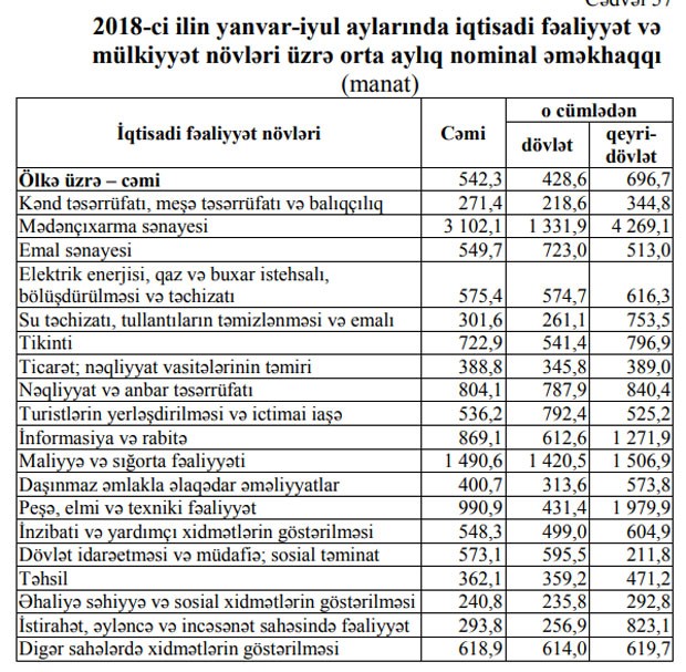 Mədənçıxarma sənayesində, maliyyə və sığorta fəaliyyəti, peşə, elmi və texniki fəaliyyət, informasiya və rabitə, nəqliyyat və anbar təsərrüfatı, eləcə də tikinti sahələrində orta aylıq nominal əməkhaqqı ölkə üzrə orta göstəricidən yüksək olmuşdur.
