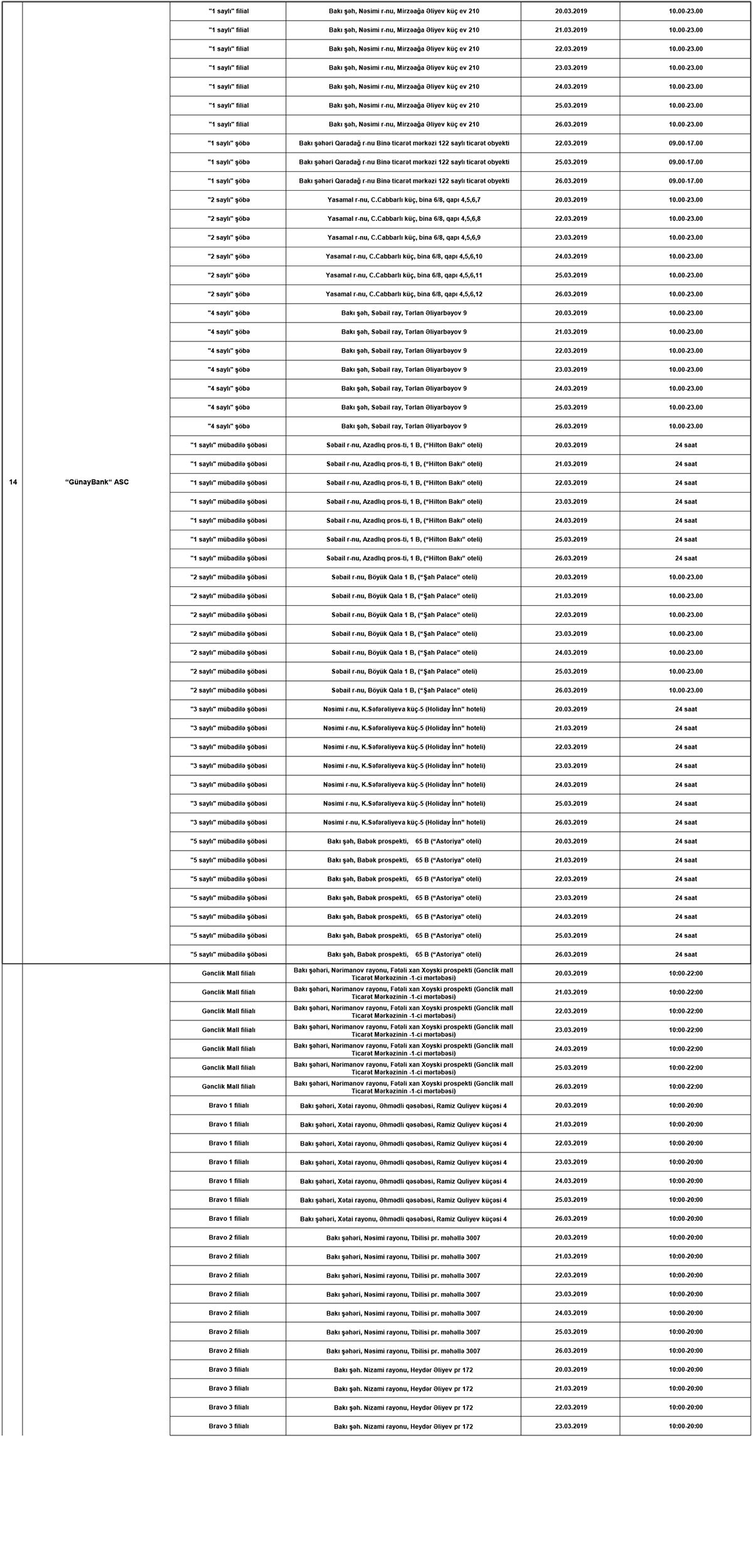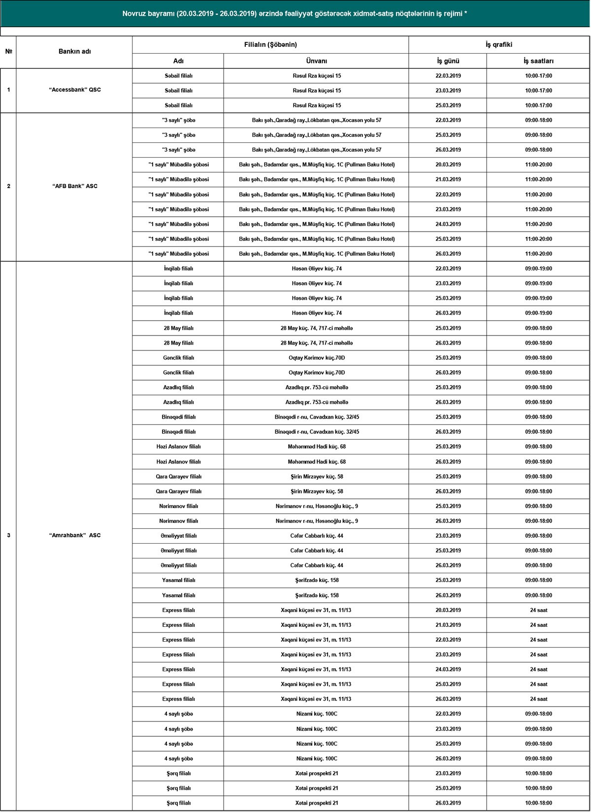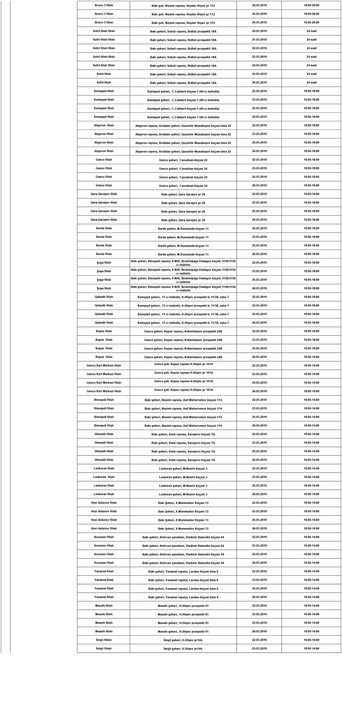 20-26 mart tarixlərində çalışacaq bank filial və şöbələrinin siyahısı və ünvanları