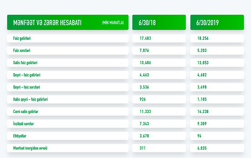 2019-cu ilin yanvar-iyun dövründə “Rabitəbank” 22 milyon 938 min manat cəmi gəlirləri əldə etmək üçün 18 milyon 10 min manat xərc çəkib. Nəticədə Bankın 4 milyon 928 min manat əməliyyat mənfəəti qalıb. Əməliyyat mənfəətinin 94 min manatı ehtiyata ayrılıb (ötən ilin eyni dövrü ilə müqayisədə 39 dəfə az) və nəticədə Bankın 4 milyon 835 min manat vergidən əvvəl mənfəəti qalıb.