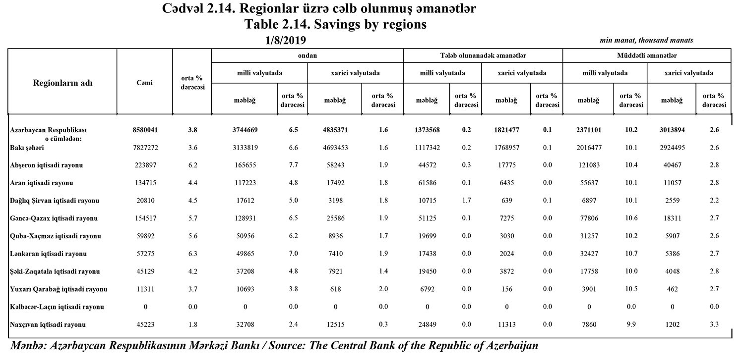 Milli valyutadakı 3 milyard 745 milyon manatlıq əmanətlər orta hesabla 6,5%, xarici valyutadakı 4 milyard 835 milyon manat əmanətlər isə orta hesabla 1,6% ilə cəlb edilib.