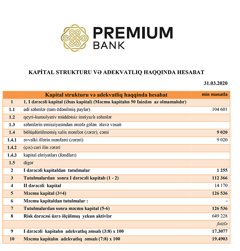 31 Mart 2020-ci il tarixində Premiumbank 126 milyon 536 min manat məcmu kapitala malik olub.