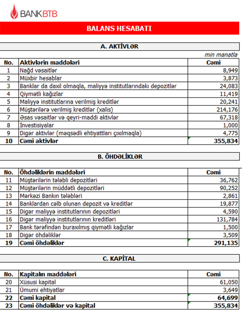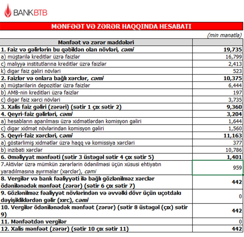 Qeyd edək ki, 2019-cu ilin yanvar-sentyabr dövründə Bank BTB-nin cəmi gəlirləri 20 milyon 633 min manat, cəmi xərcləri isə 19 milyon 295 min manat, əməliyyat mənfəəti isə 1 milyon 338 min manat təşkil etmişdi. Eyni zamanda, ehtiyatdan 2 milyon 663 min manatın azad olması hesabına mənfəət 3 milyon 999 min manata yüksəlmişdi.