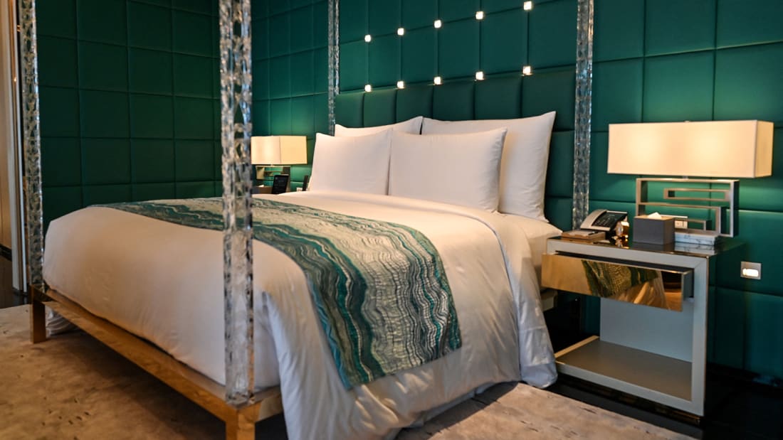 632 metr hündürlükdə yerlləşən otelin 165 nömrəsi və 34 süiti var. Ən iri məkanı 380 kvadrat metrlik Şanxay Süitdir, gecəsi 10,4 min dollardan başlayır. Ən ucuz nömrəni isə 555 dollardan sifariş etmək olar. Oteldə Çin, Yaponiya, İtaliya və digər ölkələrin mətbəxinə aid 7 böyük restoran mövcuddur.