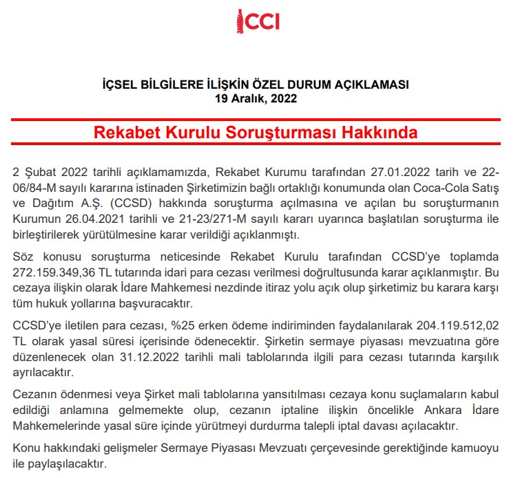 Coca Cola cəriməni ödəyəcəklərini vurğulayıb, lakin bu, ittihamları qəbul etmək demək deyil. Şirkət qanuni müddət ərzində ilk növbədə Ankara İnzibati Məhkəməsində icranın dayandırılması tələbi ilə ləğv iddiası qaldıracaqlarını bildirib.