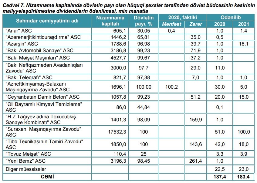 Marja.az bülletenə istinadən verdiyi məlumata görə, 2020-ci ildə dövlət büdcəsi kəsirinin maliyyələşdirilməsinə özəlləşdirmə prosesində yaradılmış və səhmləri bütövlükdə yaxud səhmlərinin bir hissəsi dövlətə məxsus olan səhmdar cəmiyyətlər tərəfindən dövlət büdcəsinə dividendlərin ödənilməsi üzrə 187,4 min manat, 2021-ci ildə isə 11 dövlət müəssisəsindən ümumilikdə 183,4 min manat vəsait daxil olmuşdur.