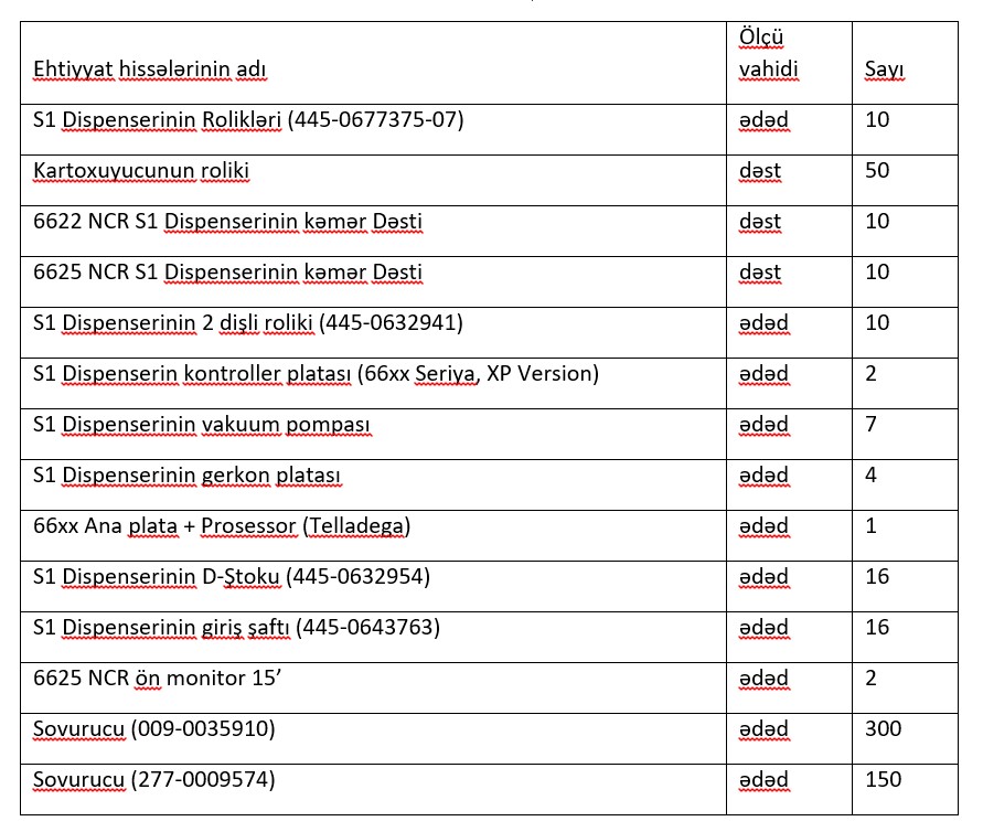 Tenderin adı: “NCR” markalı bankomatlar üçün ehtiyyat hissələrinin satın alınması