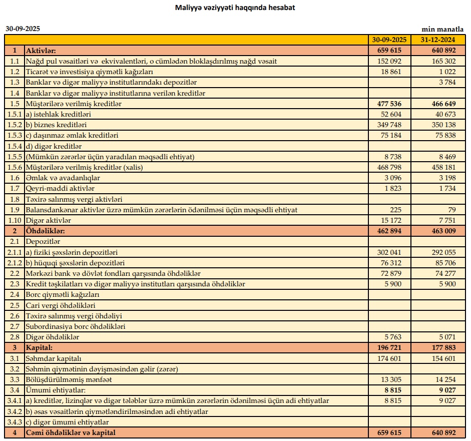 2025-cü ilin 9 ayında ilin əvvəli ilə müqaisədə fiziki şəxsərin depozitləri 9 milyon 986 min manat artaraq 302 milyon 41 min manata çatmış, hüquqi şəxslərin depozitlərində isə 9 milyon 394 min manat azalaraq 76 milyon 312 min manat təşkil etmişdir.