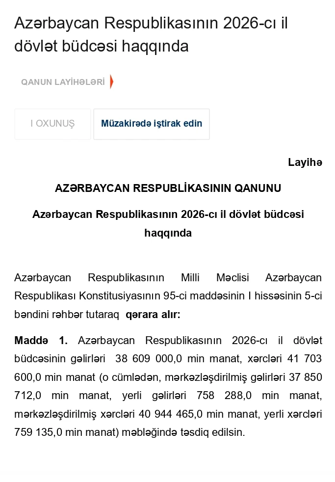 Azərbaycan Respublikasının 2026-cı il dövlət büdcəsi haqqında qanun layihəsi ictimai müzakirəyə çıxarılıb.