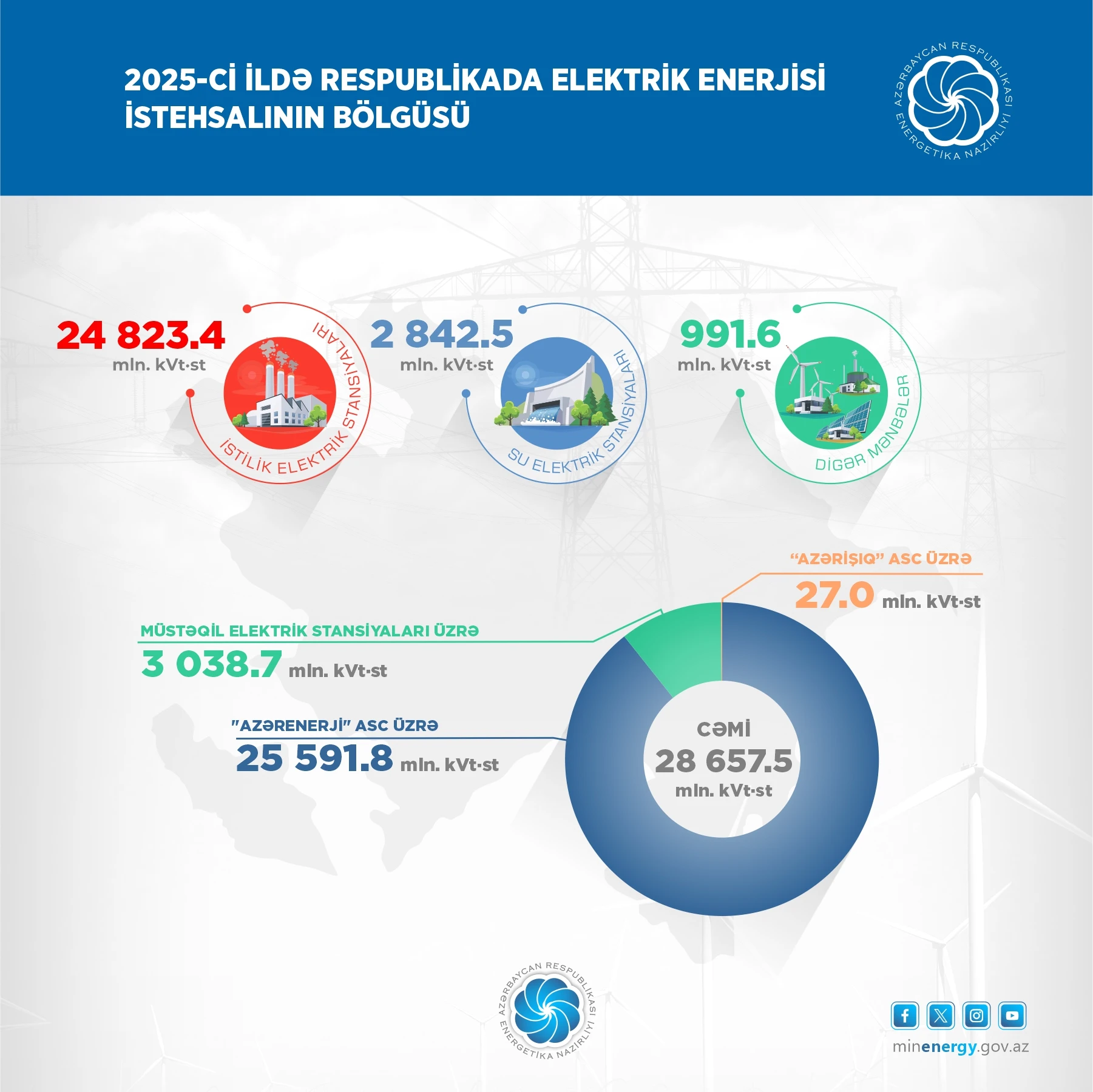 Energetika Nazirliyinin yaydığı məlumatda bildirilir ki, bu dövrdə İES-lərdə 24 823,4 mln. kVt·st, SES-lərdə 2 842,5 mln. kVt·st, digər mənbələr üzrə isə 991,6 mln. kVt·st, o cümlədən külək elektrik stansiyalarında 169,7 mln. kVt·st, günəş elektrik stansiyalarında 599,8 mln. kVt·st, Bərk Məişət Tullantılarının Yandırılması Zavodunda isə 222,1 mln. kVt·st elektrik enerjisi istehsal edilib.