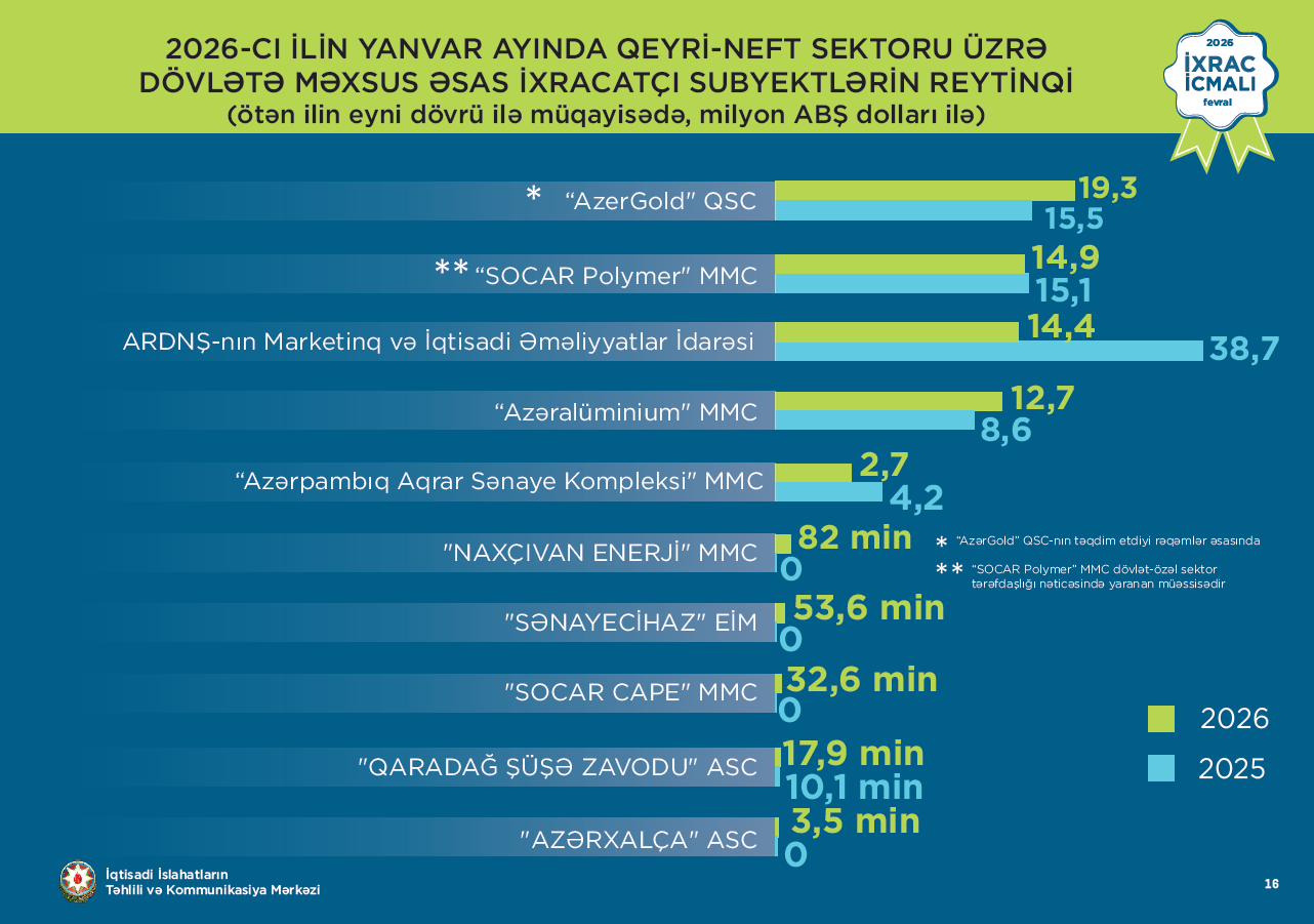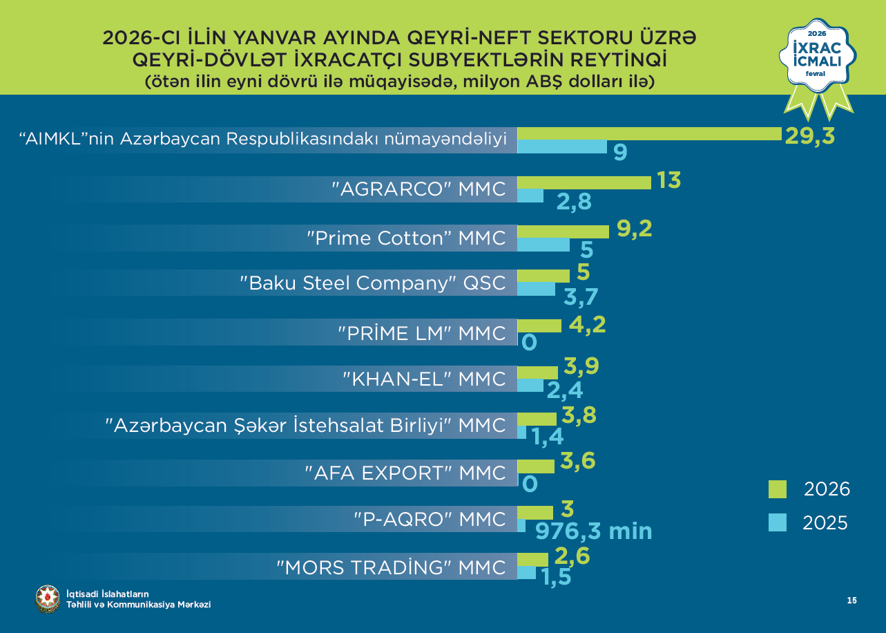 İcmala əsasən, 2026-cı ilin yanvar ayı üzrə hazırlanmış qeyri-dövlət (özəl) ixracatçı subyektlərin reytinqində ilk onluqda aşağıdakı şirkətlər təmsil olunublar: