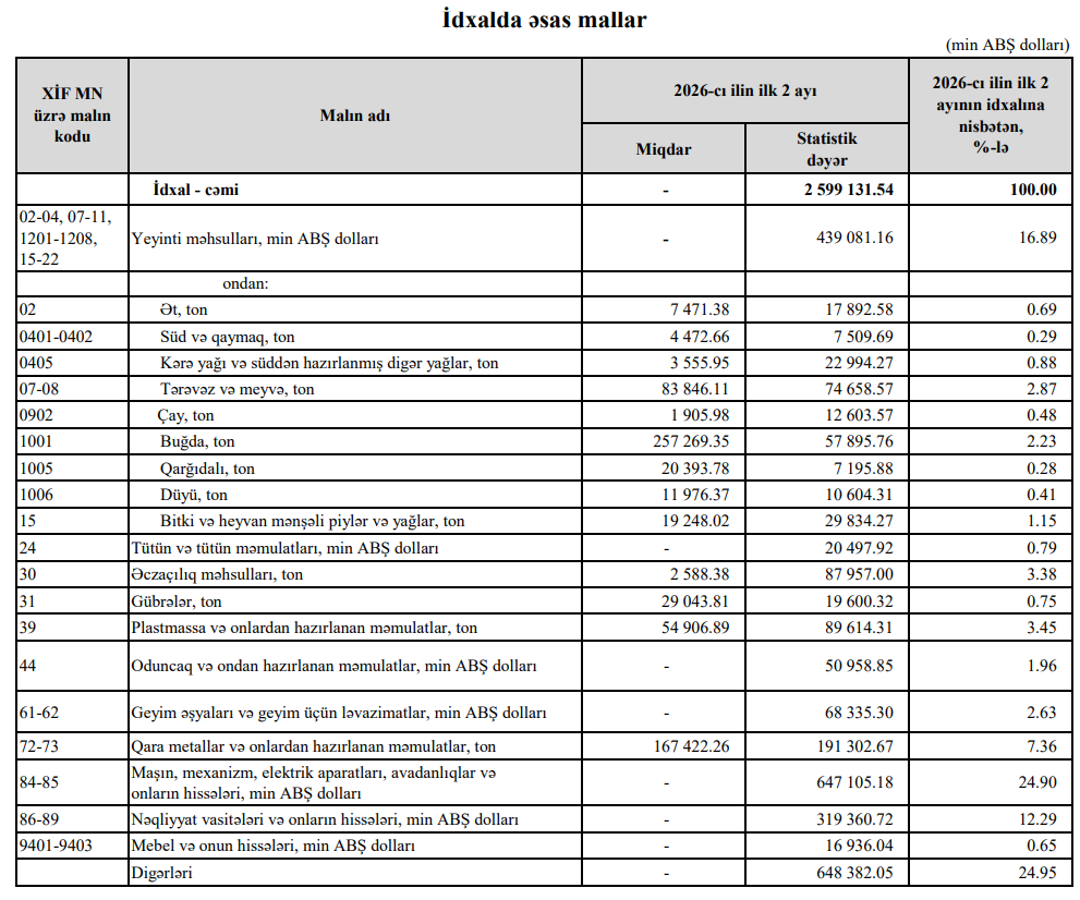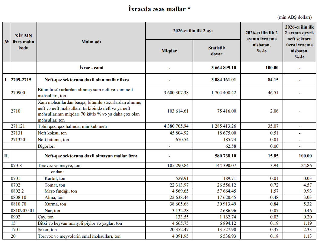 2026-cı ilin yanvar - fevral aylarında Azərbaycanın ən çox ixrac və idxal etdiyi mallar.