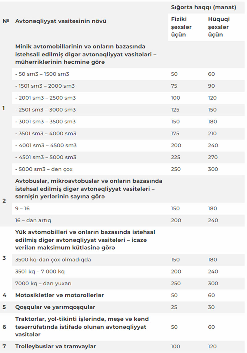 Hazırda minik avtomobillərinin və onların bazasında istehsali edilmiş digər avtonəqliyyat vasitələrinin mühərriklərinin həcminə görə sığorta haqqı belədir.