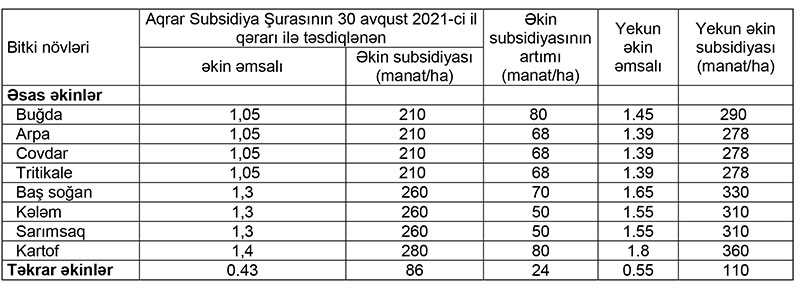 Kənd Təsərrüfatı Nazirliyinin yaydığı məlumatda bildirilir ki, Aqrar Subsidiya Şurasının qərarına əsasən, 2022-ci ildə buğda, arpa, çovdar, tritikale, kartof, baş soğan, kələm, sarımsaq bitkilərinin əsas əkinlərinə, qarğıdalı, günəbaxan, soya, darı, sorqo və kartof bitkilərinin təkrar əkinlərinə görə verilən əkin subsidiyasının artımı və yekun əkin subsidiyasının məbləği aşağıdakı kimi müəyyən olunub: