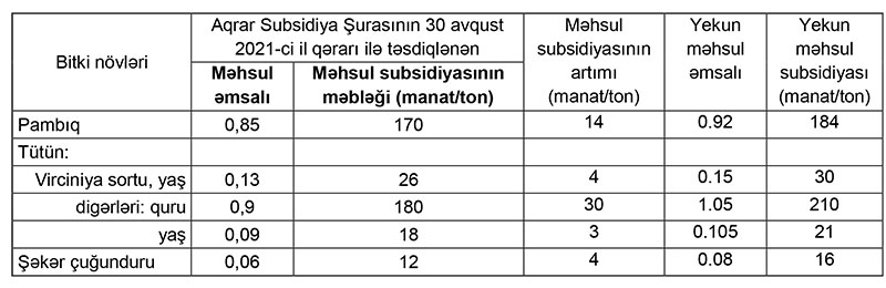 Aqrar Subsidiya Şurasının qərarına əsasən, 2022-ci ildə pambıq, tütün və şəkər çuğunduru üzrə məhsul subsidiyasının artımı və yekun məhsul subsidiyasının məbləği aşağıdakı kimi müəyyən olunub: