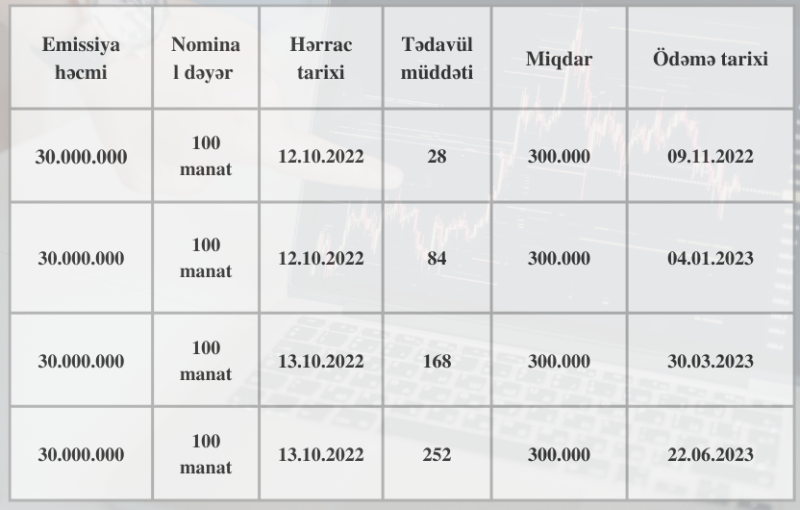12 və 13 oktyabr 2022-ci il tarixlərində Bakı Fond Birjasında Azərbaycan Respublikasının Mərkəzi Bankının notlarının yerləşdirilməsi üzrə hərrac keçiriləcəkdir.