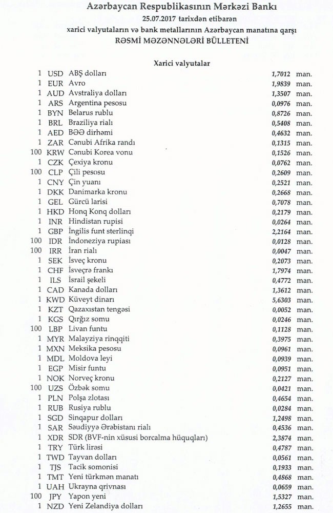 İyulun 25-nə Mərkəzi Bankın açıqladığı rəsmi Dollar/manat məzənnəsi İyulun 24-ü ilə müqayisədə dəyişməyərək 1,7012 manat olub, Avro/manat məzənnəsi isə 1.9839 manata düşüb.