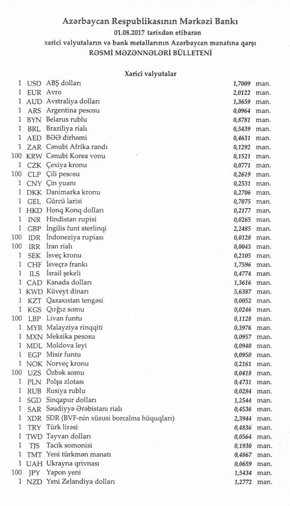 İyulun 31-də rəsmi olaraq 1 dollar 1,7009 manata, 1 avro isə 1.9963 manata bərabər idi.