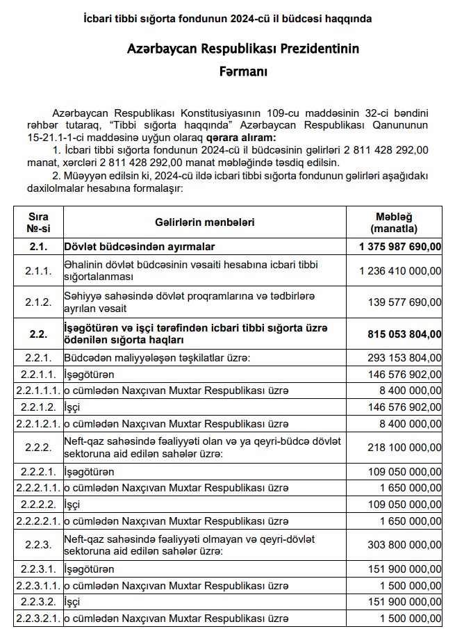 Prezident İlham Əliyev İcbari tibbi sığorta fondunun 2024-cü il büdcəsini təsdiq edib.