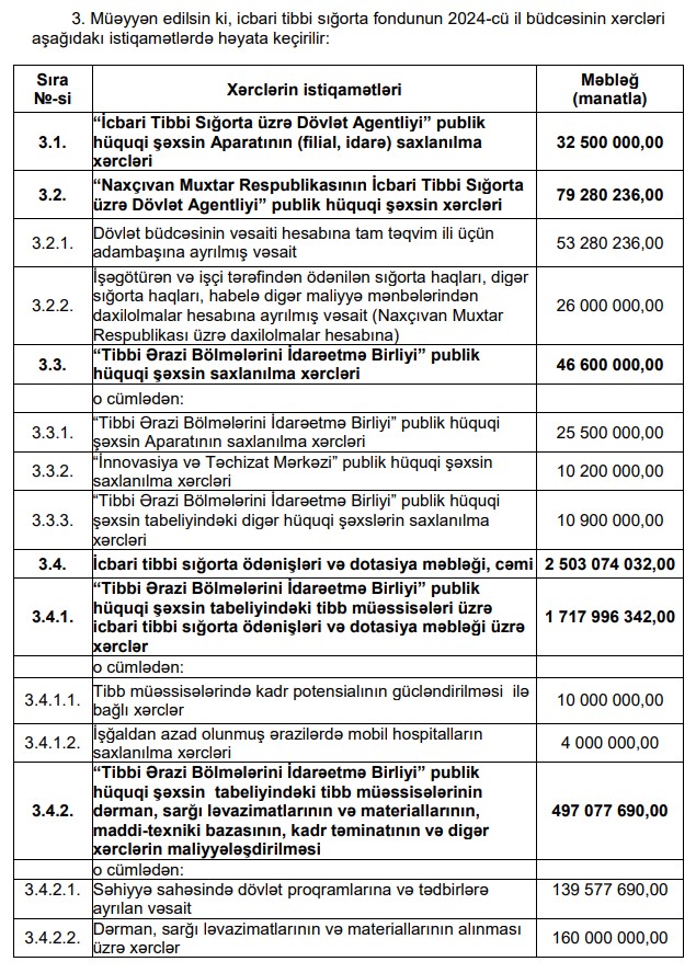 Fondun xərclərinin isə 2 503 074 032 manatını icbari tibbi sığorta ödənişləri və dotasiya təşkil edəcək.