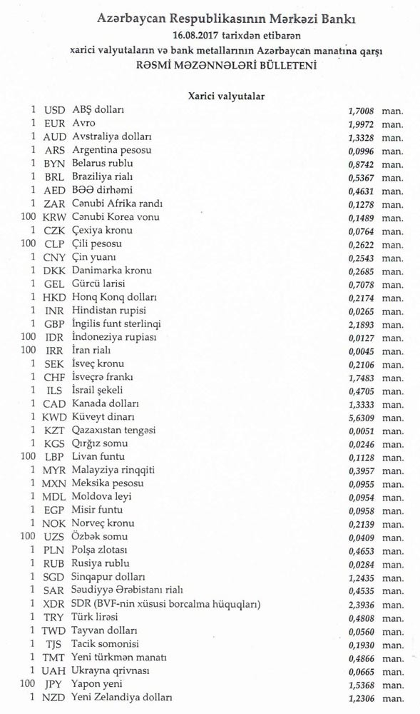 Avqustun 15-də rəsmi olaraq 1 dollar 1,7007 manata, 1 avro isə 2.0030 manata bərabər idi.