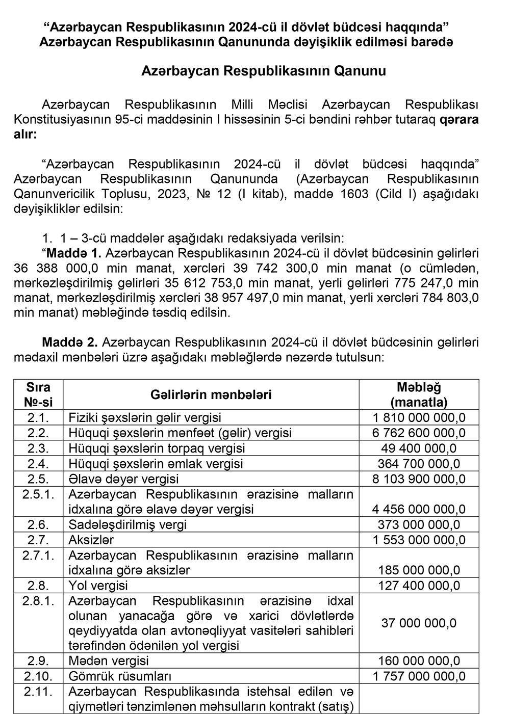 Prezident İlham Əliyev “Azərbaycan Respublikasının 2024-cü il dövlət büdcəsi haqqında” Azərbaycan Respublikasının Qanununda dəyişiklik edilməsi barədə” qanunu təsdiqləyib.