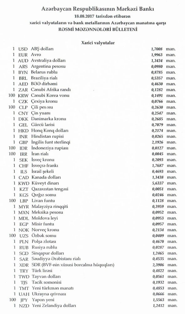 Avqustun 17-d’rəsmi olaraq 1 dollar 1,7008 manata, 1 avro isə 2.0035 manata bərabər idi.