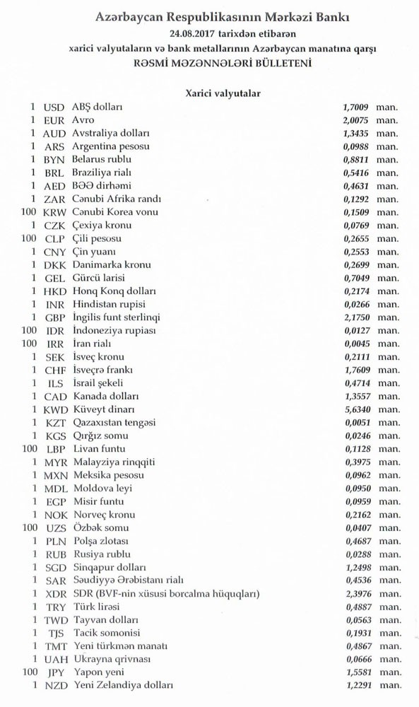 Avqustun 24-nə Mərkəzi Bankın açıqladığı rəsmi Dollar/manat məzənnəsi Avqustun 23-ü ilə müqayisədə dəyişməyərək 1,7009 manat olub, Avro/manat məzənnəsi isə 2.0075 manata qalxıb.