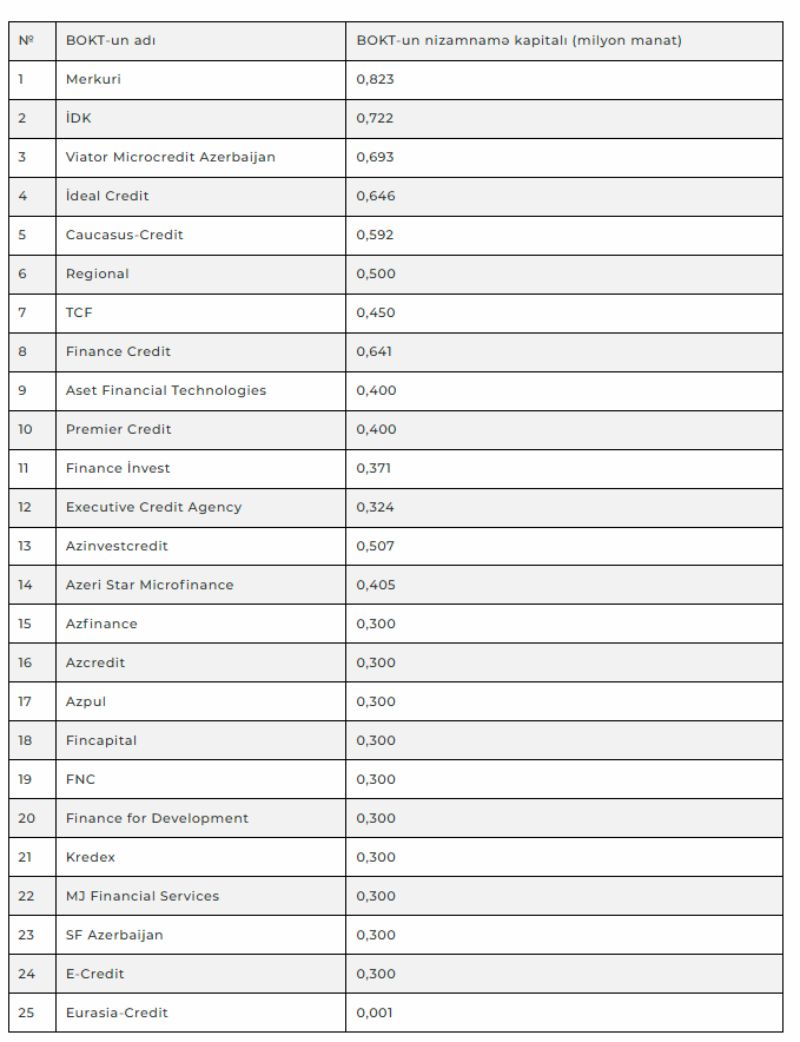 Azərbaycanda fəaliyyət göstərən 57 bank olmayan kredit təşkilatından (BOKT) 25-nin nizamnamə kapitalı 1 milyon manatdan azdır.